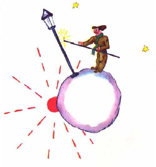 第五颗行星非常奇怪,是这些星星中最小的一颗。行星上刚好能容得下一盏路灯和一个点路灯的人。小王子怎么也解释不通:这个坐落在天空某一角落,既没有房屋又没有居民的行星上,要一盏路灯和一个点灯的人做什么用。