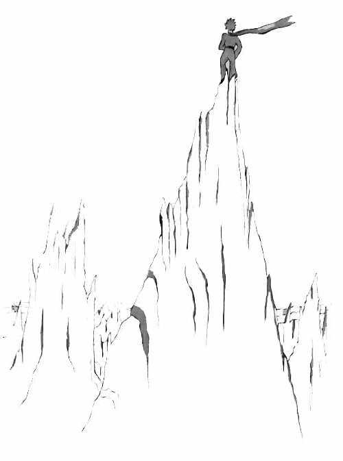 小王子爬上一座高山。过去他所见过的山就是那三座只有他膝盖那么高的火山,并且他把那座熄灭了的火山就当作凳子。小王子自言自语地说道:“从这么高的山上,我一眼可以看到整个星球,以及所有的人。”可是,他所看到的只是一些非常锋利的悬崖峭壁。